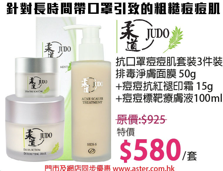 針對長時間帶口罩引致的粗糙痘痘肌 套裝包括: 柔道排毒淨膚面膜 50g+ 柔道痘痘抗紅褪印霜 15g+ 柔道 痘痘標靶療膚液 100ml